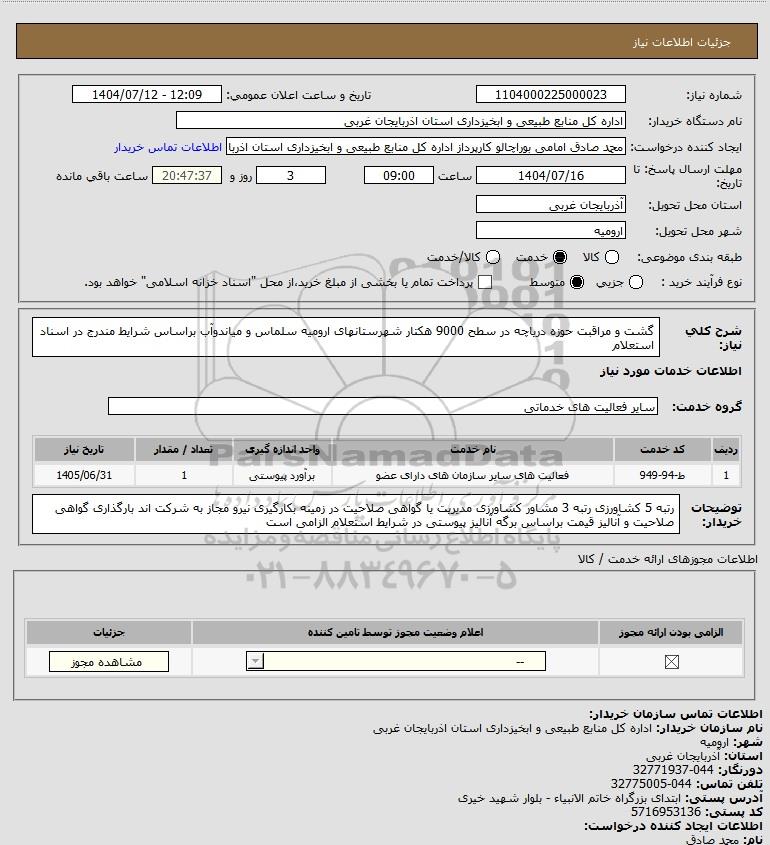 شرح کلی نیاز: گشت و مراقبت حوزه دریاچه در سطح 9000 هکتار شهرستانهای ارومیه سلماس و میاندوآب براساس شرایط مندرج در اسناد استعلام