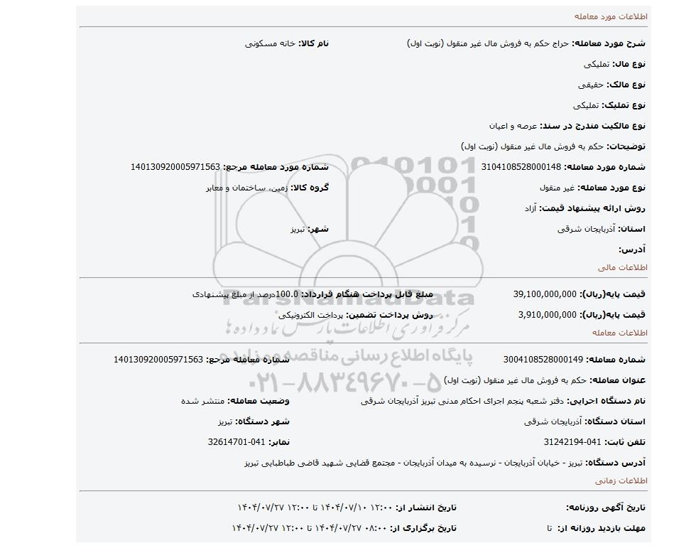 | شرح مورد معامله: حراج حکم به فروش مال غیر منقول (نوبت اول) | نام کالا: خانه مسکونی | |