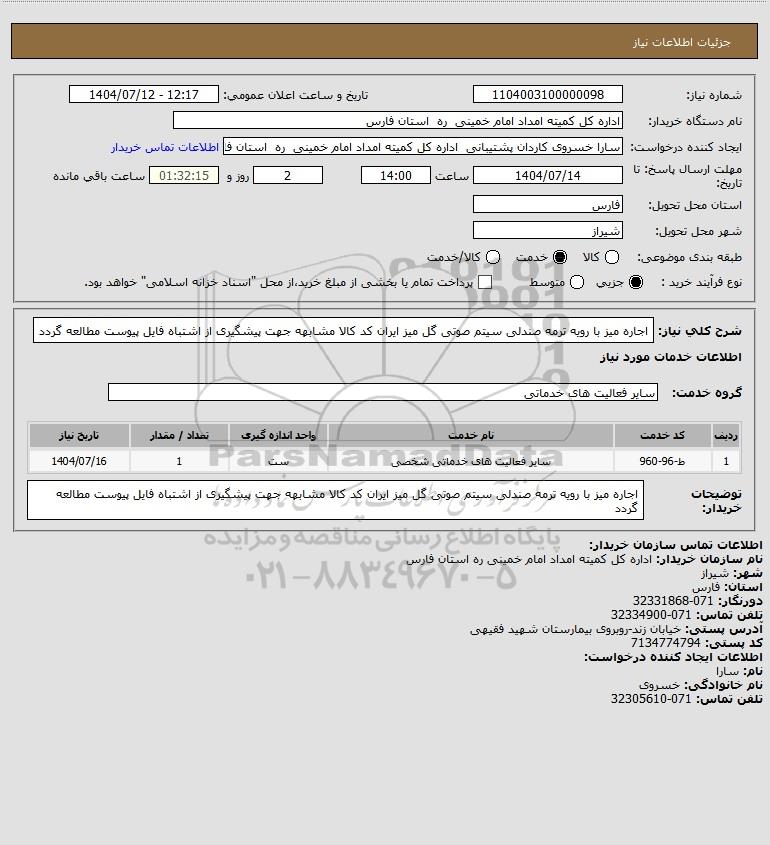 شرح کلی نیاز: اجاره میز با رویه ترمه صندلی سیتم صوتی گل میز ایران کد کالا مشابهه جهت پیشگیری از اشتباه فایل پیوست مطالعه گردد