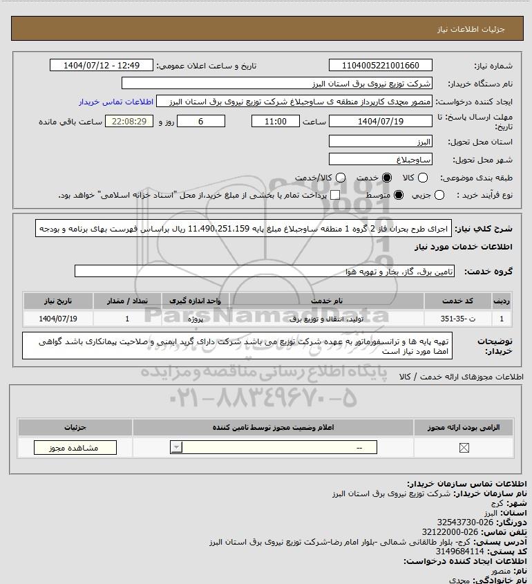 شرح کلی نیاز: اجرای طرح بحران فاز 2 گروه 1 منطقه ساوجبلاغ مبلغ پایه 11،490،251،159 ریال براساس فهرست بهای برنامه و بودجه