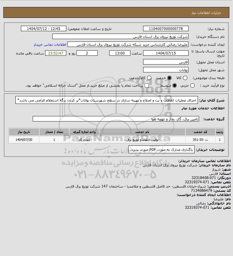 شرح کلی نیاز: اجرای عملیات اتفاقات و نت و اصلاح و بهینه سازی در سطح شهرستان بوانات*پر کردن برگه استعلام الزامی می باشد*