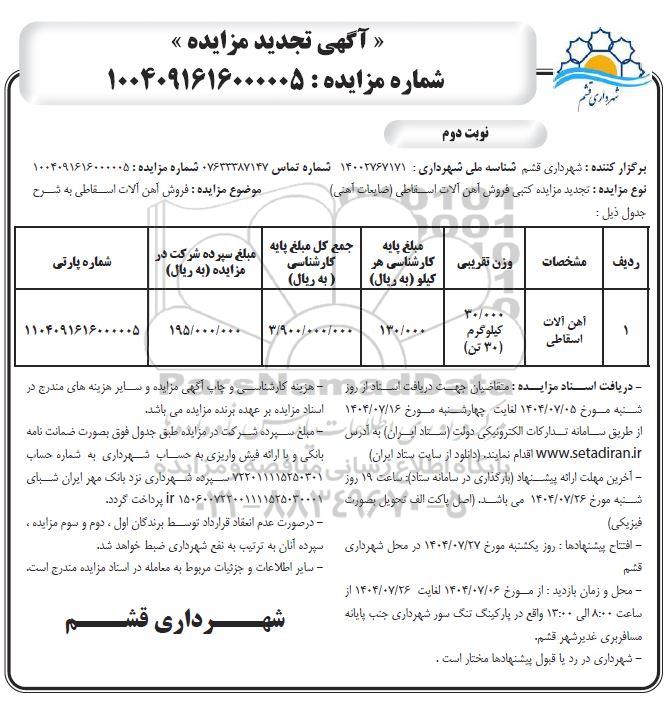 نوع مزایده: تجدید مزایده کتبی فروش آهن آلات اسقاطی (ضایعات آهنی)