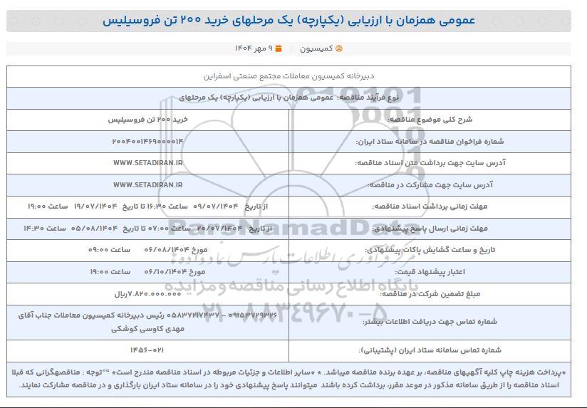 عمومی همزمان با ارزیابی (یکپارچه) یک مرحله ای خرید 200 تن فروسیلیس