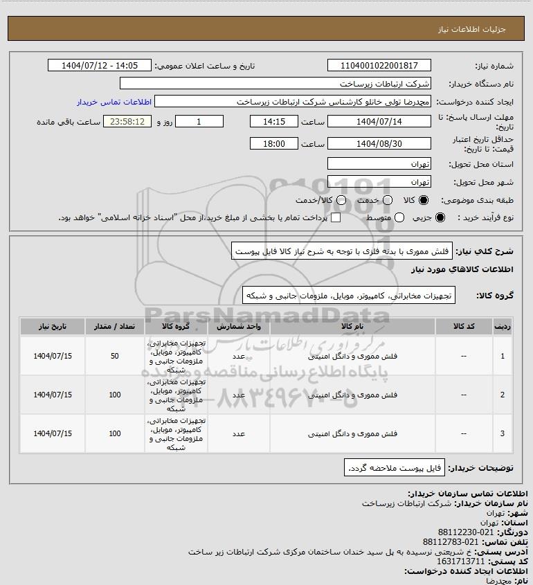 | 3 | -- | فلش مموری و دانگل امنیتی | عدد | تجهیزات مخابراتی، کامپیوتر، موبایل، ملزومات جانبی و شبکه | 100 | 1404/07/15 |