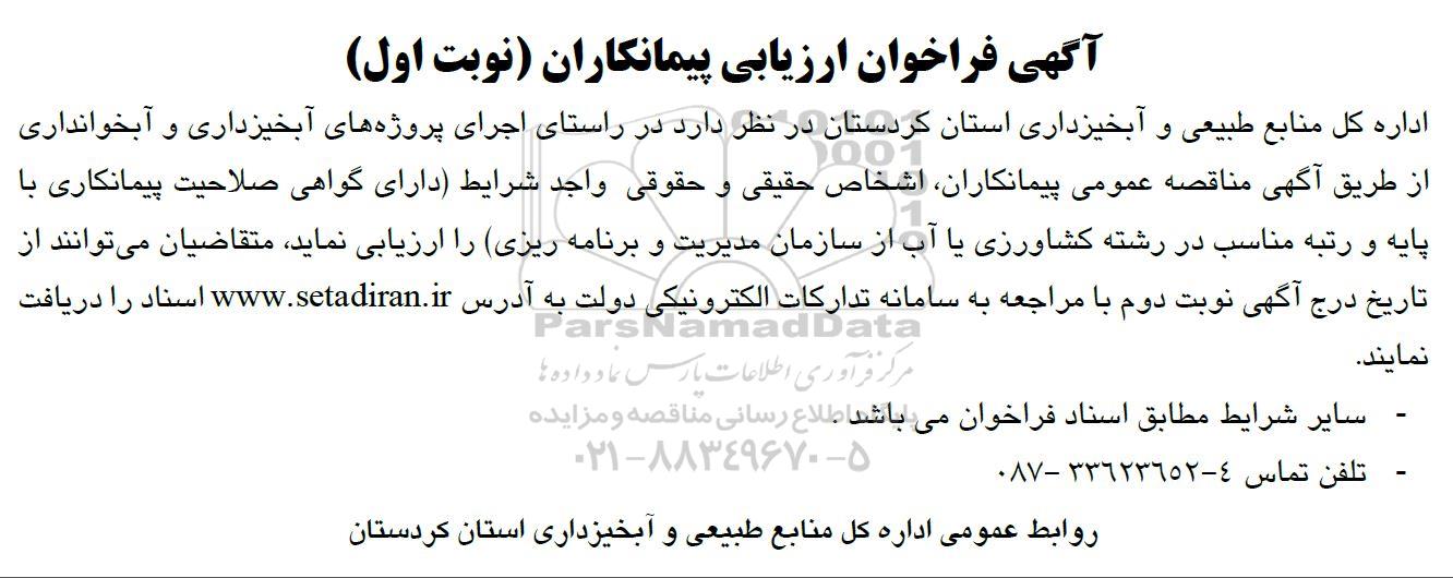 اداره کل منابع طبیعی و آبخیزداری استان کردستان در نظر دارد در راستای اجرای پروژه های آبخیزداری و آبخوانداری از طریق آگهی مناقصه عمومی پیمانکاران اشخاص حقیقی و حقوقی واجد شرایط دارای گواهی صلاحیت پیمانکاری با پایه و رتبه مناسب در رشته کشاورزی یا آب از سازمان مدیریت و برنامه ریزی را ارزیابی نماید متقاضیان میتوانند از تاریخ درج آگهی نوبت دوم با مراجعه به سامانه تدارکات الکترونیکی دولت به آدرس ستاد ایران اسناد را دریافت نمایند.