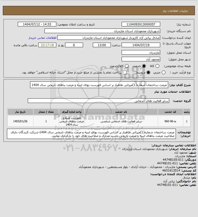 شرح کلی نیاز: مرمت ساختمان شماره(1)میراثی طاهباز بر اساس فهرست بهای ابنیه و مرمت بناهای تاریخی سال 1404