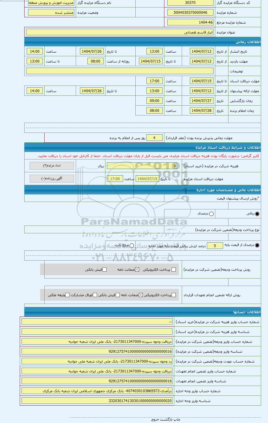 | شماره مورد اجاره | 5104030370000046 | نوع برگزاری مزایده | مزایده عمومی | |