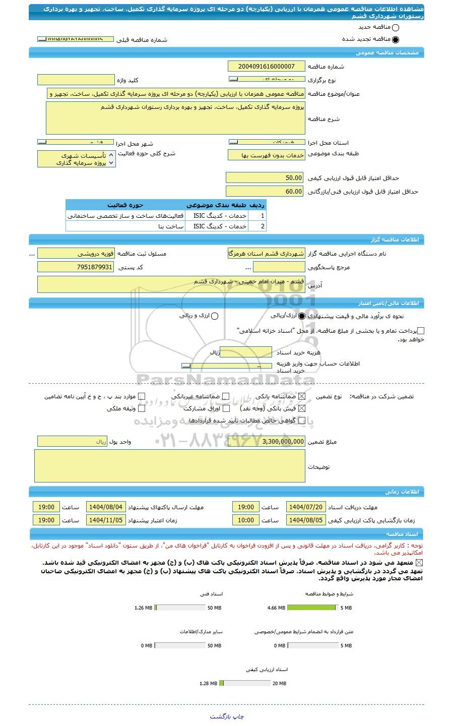 شرح مناقصهپروژه سرمایه گذاری تکمیل، ساخت، تجهیز و بهره برداری رستوران شهرداری قشم