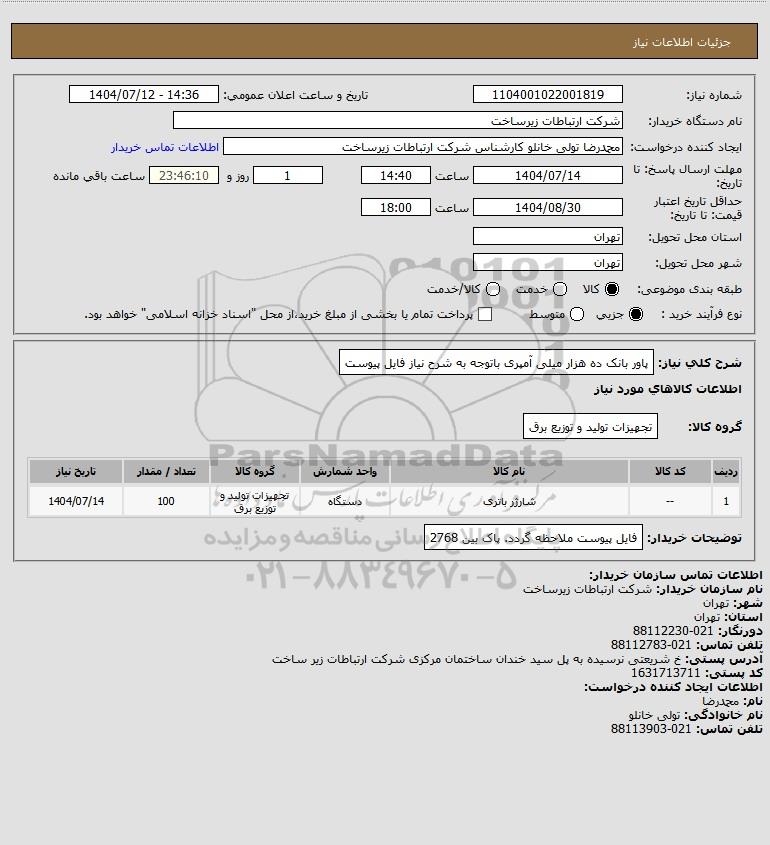استعلام پاور بانک ده هزار میلی آمپری باتوجه به شرح نیاز فایل پیوست, استعلام پاور بانک ده هزار میلی آمپری باتوجه به شرح نیاز فایل پیوست