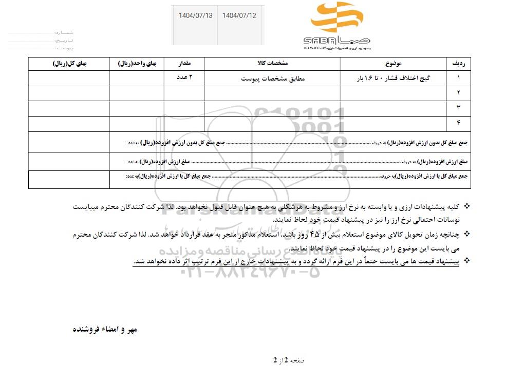 استعلام بها و موضوع استعلام استعلام گیج اختلاف فشار 0 تا 1.6 بار به اطلاع کلیه شرکت‌ها و افراد متخصص واجد شرایط می‌رساند، آگهی گذار در نظر دارد از طریق استعلام بها، نسبت به انتخاب و دریافت پیشنهادات اقدام نماید. این استعلام با کد آگهی ثبت شده در سامانه خبرگزاری پارس نماد : 9642357 منتشر شده است. مشخصات استعلام : تاریخ شروع استعلام: 1404/07/12 آخرین مهلت ارسال پیشنهاد قیمت : 1404/07/13 و محل اجرای پروژه : استان سایر میباشد. استعلام قیمت مورد درخواست : استعلام گیج اختلاف فشار 0 تا 1.6 بار با دسته‌بندی‌های تخصصی و گروه های مرتبط : ابزار دقیق, نیروگاه, تجهیزات برق و الکترونیک, استعلام اطلاع رسانی میگردد. شرایط شرکت در استعلام آنلاین : ابتدا ثبت نام در سامانه استعلام پارس نماد و تکمیل مدارک موردنیاز و بارگذاری در سامانه رعایت تمامی ضوابط و الزامات مندرج در اسناد استعلام است.