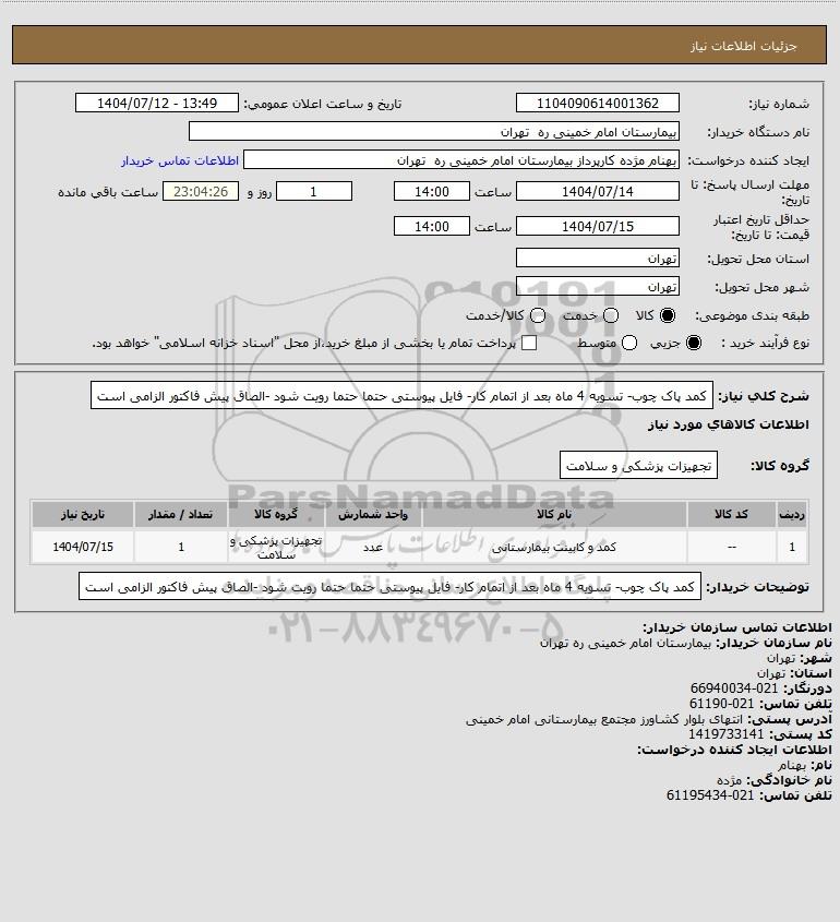| 1 | -- | کمد و کابینت بیمارستانی | عدد | تجهیزات پزشکی و سلامت | 1 | 1404/07/15 |