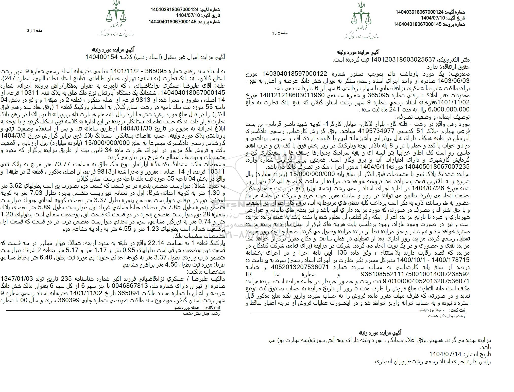 به استناد سند رفتی شماره 365095 - 1401.11.2 تنظیمی دفترخانه اسناد رسمی شماره 9 شهر رشت استان گیلان له بانک تجارت به نشانی تهران خیابان طالقانی تقاطع استاد نجات اللهی، شماره (247) عليه آقای عليرضا عسکري نژاد قاضیانی که نامبرده به عنوان بدهکار اراهن پرونده اجرایی شماره 140404018067000145، ششدانگ یک دستگاه آپارتمان نوع ملک طلق به پلاک ثبتی 10311 فرعی از 14 اصلی، مقرور و مجزا شده از 9813 فرعی از اصلی مذکور ، قطعه 2 در طبقه 1 و واقع در بخش 04 ناحيه 55 حوزه ثبت ملک ناحیه دو رشت استان گیلان به انضمام پارکینگ قطعه 1 وفق مفاد سند رهنی فوق الذکر را در قبال مبلغ مورد رهن شش میلیارد ریال بانضمام خسارت تاخیر روزانه تا یوم الادا در رهن بانک تجارت قرار داده اند که حسب تقاضای بستانکار پرونده در این اداره به کلاسه فوق تشکیل گردید و با توجه به ابلاغ اجرائیه به مدیون در تاریخ 1404.01.30 از طریق سامانه ثنا و پس از استعلام وضعیت ثبتی و بازداشتی پلاک مورد وثیقه حسب تقاضای بستانکار ششدانگ پلاک فوق برابر گزارش مورخ 1404.3.3 کارشناس رسمی دادگستری مجموعاً به مبلغ 15.000.000.000 پانزده میلیارد ریال ارزیابی و قطعیت یافت و فروش ملک مزبور در اجرای مقررات ماده 34 قانون ثبت از طریق مزایده برگزار که حدود و مشخصات و توصیف اجمالی به شرح زیر بیان می گردد.