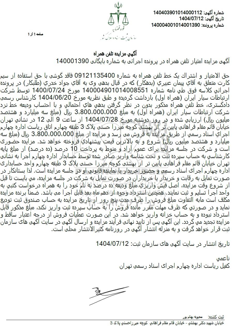 آگهی مزایده امتیاز تلفن همراه در پرونده اجرائی به شماره بایگانی 140001390