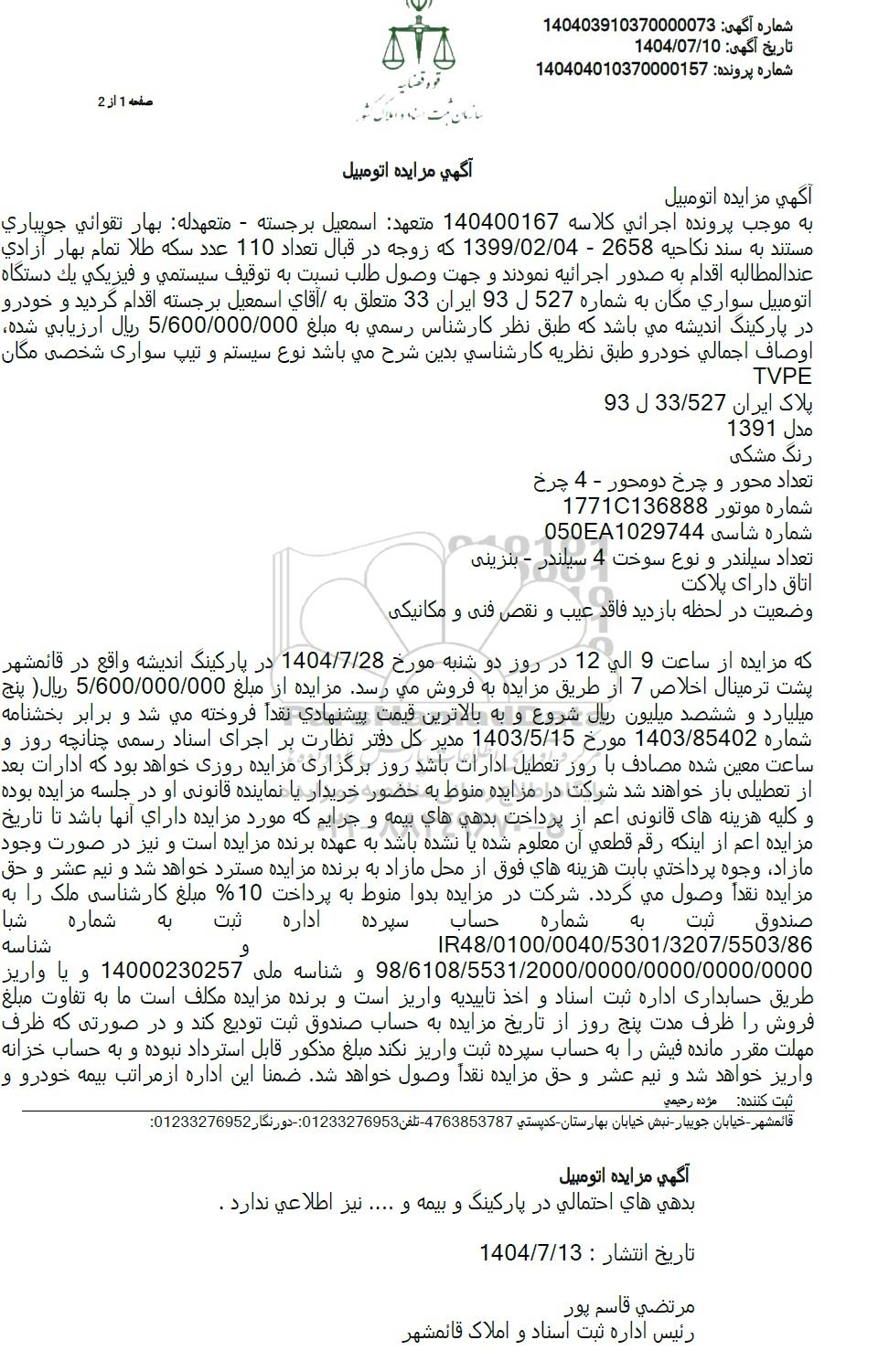 به موجب پرونده اجرائی کلاسه 140400167 متعهد اسمعیل برجسته - متعهدله بهار تقوائی جویباری مستند به سند نکاحیه 2658 - 1399.02.04 که زوجه در قبال تعداد 110 عدد سکه طلا تمام بهار آزادی عندالمطالبه اقدام به صدور اجرائیه نمودند و جهت وصول طلب نسبت به توقیف سیستمی و فیزیکی یک دستگاه اتومبیل سواری مگان به شماره 527 ل 93 ایران 33 متعلق به آقای اسمعیل برجسته اقدام گردید و خودرو در پارکینگ اندیشه می باشد که طبق نظر کارشناس رسمی به مبلغ 5.600.000.000 ریال ارزیابی شده اوصاف اجمالی خودرو طبق نظریه کارشناسی بدین شرح می باشد نوع سیستم و تیپ سواری شخصی مگان TVPE93 پلاک ایران 33.527 ل1391 مدل رنگ مشکی تعداد محور و چرخ دو محور - 4 چرخ 17710136888 شماره موتور 050EA1029744 شماره شاسیتعداد سیلندر و نوع سوخت 4 سیلندر - بنزینیاتاق دارای پلاکتوضعیت در لحظه بازدید فاقد عیب و نقص فنی و مکانیکی که مزایده از ساعت 9 الی 12 در روز دو شنبه مورخ 1404.7.28 در پارکینگ اندیشه واقع در قائمشهر پشت ترمینال اخلاص 7 از طریق مزایده به فروش میرسد مزایده از مبلغ 5.600.000.000 ریال ( پنج میلیارد و ششصد میلیون ریال شروع و به بالاترین قیمت پیشنهادی نقدا فروخته می شد و برابر بخشنامه شماره 1403/85402 مورخ 1403.5.15 مدیر کل دفتر نظارت بر اجرای اسناد رسمی چنانچه روز و ساعت معین شده مصادف با روز تعطیل ادارات باشد روز برگزاری مزایده روزی خواهد بود که ادارات بعد از تعطیلی باز خواهند شد شرکت در مزایده منوط به حضور خریدار یا نماینده قانونی او در جلسه مزایده بوده و کلیه هزینه های قانونی اعم از پرداخت بدهی های بیمه و جرایم که مورد مزایده دارای آنها باشد تا تاریخ مزایده اعم از اینکه رقم قطعی آن معلوم شده یا نشده باشد به عهده برنده مزایده است و نیز در صورت وجود مازاد وجوه پرداختی بابت هزینه های فوق از محل مازاد به برنده مزایده مسترد خواهد شد و نیم عشر و حق مزایده نقداً وصول می گردد. شرکت در مزایده بدوا منوط به پرداخت 10% مبلغ کارشناسی ملک را به صندوق ثبت اداره به شماره حساب سپرده ثبت به شماره شبا IR48.0100.0040.5301.3207.5503.86 و شناسه 98.6108.5531.2000.0000.0000.0000.0000 و شناسه ملی 14000230257 و یا واریز طریق حسابداری اداره ثبت اسناد و اخذ تاییدیه واریز است و برنده مزایده مکلف است ما به تفاوت مبلغ فروش را ظرف مدت پنج روز از تاریخ مزایده به حساب صندوق ثبت تودیع کند و در صورتی که ظرف مهلت مقرر مانده فیش را به حساب سپرده ثبت واریز نکند مبلغ مذکور قابل استرداد نبوده و به حساب خزانه واریز خواهد شد و نیم عشر و حق مزایده نقداً وصول خواهد شد. ضمنا این اداره از مراتب بیمه خودرو و بدهی های احتمالی در پارکینگ و بیمه و .. نیز اطلاعی ندارد.