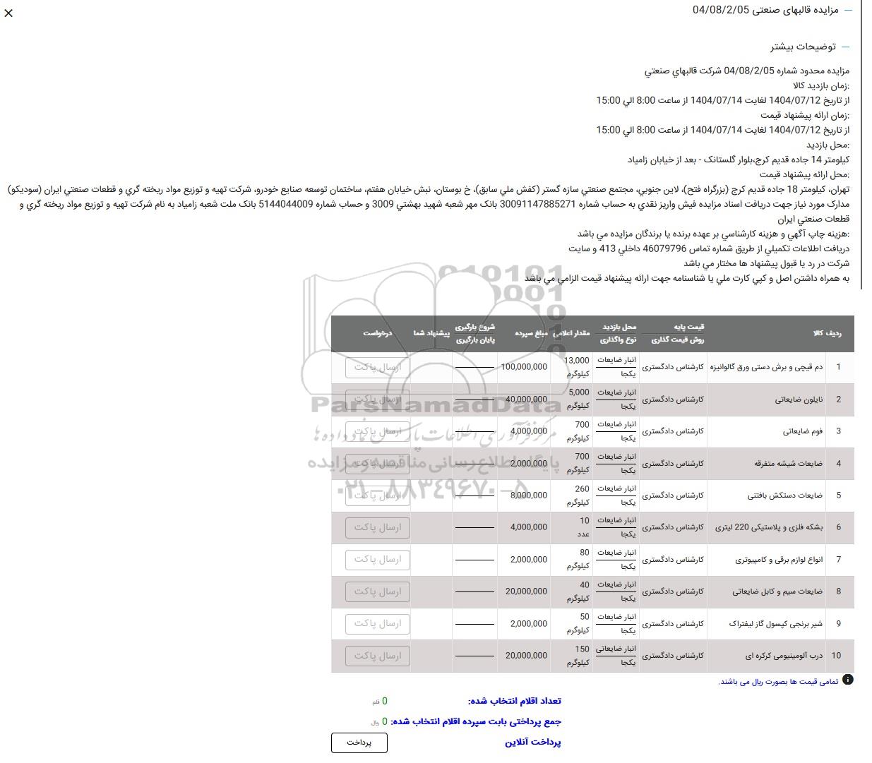مزایده عمومی مزایده دم قیچی و برش دستی ورق گالوانیزه برگزار میگردد. از کلیه افراد متخصص و شرکتهای واجد شرایط دعوت به عمل میآید تا در این مزایده با کد خبرگزاری پارس نماد : 9642613 شرکت نمایند تاریخ شروع مزایده : 1404/07/12 مهلت شرکت در مزایده: تا پایان روز 1404/07/14 مکان برگزاری اموال واگذاری استانهای تهران و دستهبندیهای مربوط به این حراجی آلومینیوم و پروفیل PVC, برق, سیم و کابل, شیرآلات, قطعات خودرو, کامپیوتر, لیفتراک, مواد شیمیایی, انواع گاز های طبی و صنعتی, آهن آلات, بشکه, پلاستیک ، پلی اتیلن و مستر بچ, شیشه, مصالح ساختمانی, قطعات مس و برنج, متفرقه میباشد.