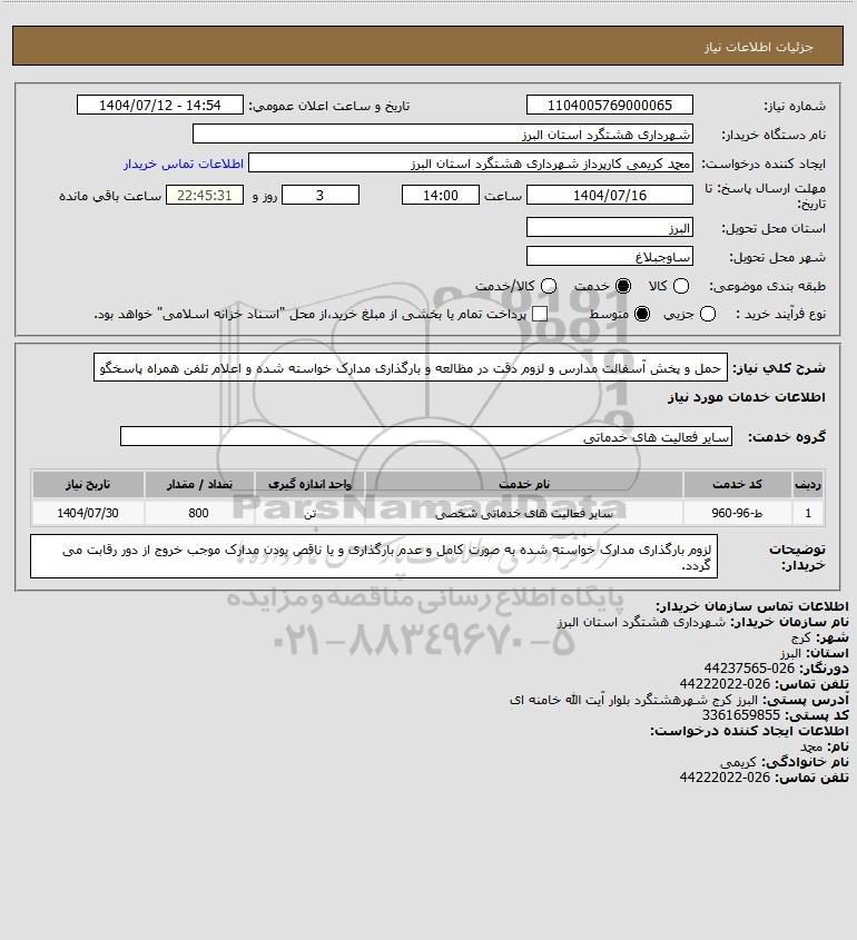 شرح کلی نیاز: حمل و پخش آسفالت مدارس و لزوم دقت در مظالعه و بارگذاری مدارک خواسته شده و اعلام تلفن همراه پاسخگو