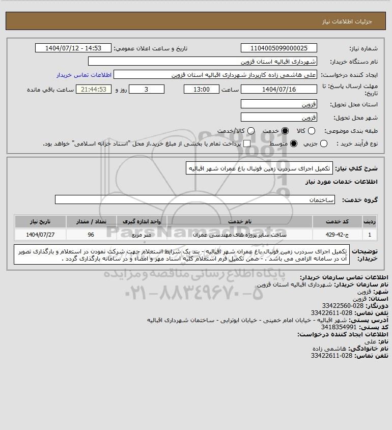 شرح کلی نیاز: تکمیل اجرای سردرب زمین فوتبال باغ عمران شهر اقبالیه