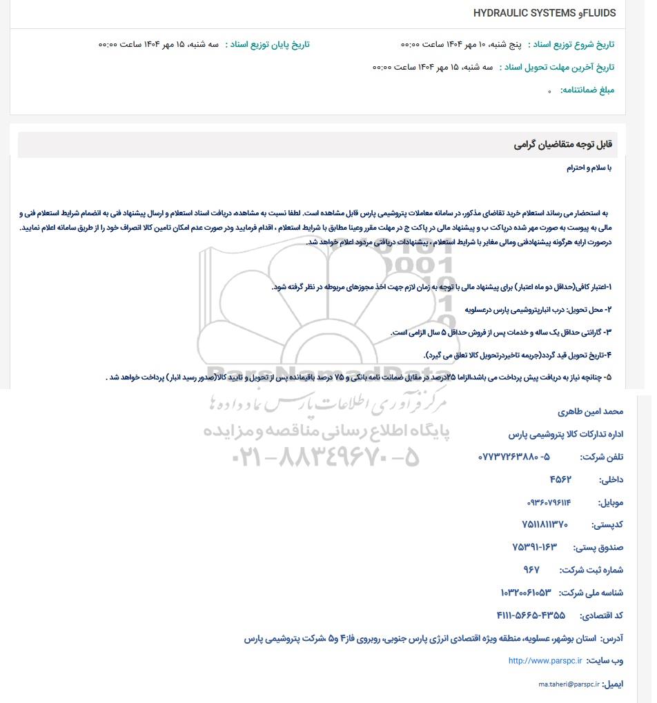 در صورت نیاز به دریافت راهنمایی یا پشتیبانی در خصوص استعلام و مناقصه و فراخوان مناقصه عمومی، مناقصه محدود، مناقصه بین‌ المللی، مناقصه دولتی، مناقصه خصوصی، مناقصه آنلاین فروش تجهیزات، مناقصه مشاوره‌ای مناقصه پتروشیمی و انرژی مناقصه صنایع و تجهیزات برق و مخابرات و نفت و گاز ... لطفاً با سایت خبری مناقصه و مزایده پارس‌نماد داده‌ها به شماره 88349670 تماس حاصل فرمایید.