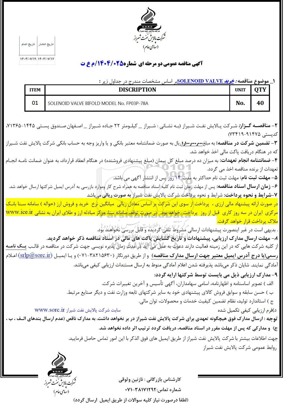 آگهی مناقصه عمومی دو مرحله ای شماره 1404.025 . م ع ت