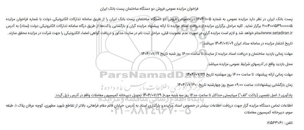 فراخوان مزایده عمومی فروش دودستگاه ساختمان پست بانک ایران ؟