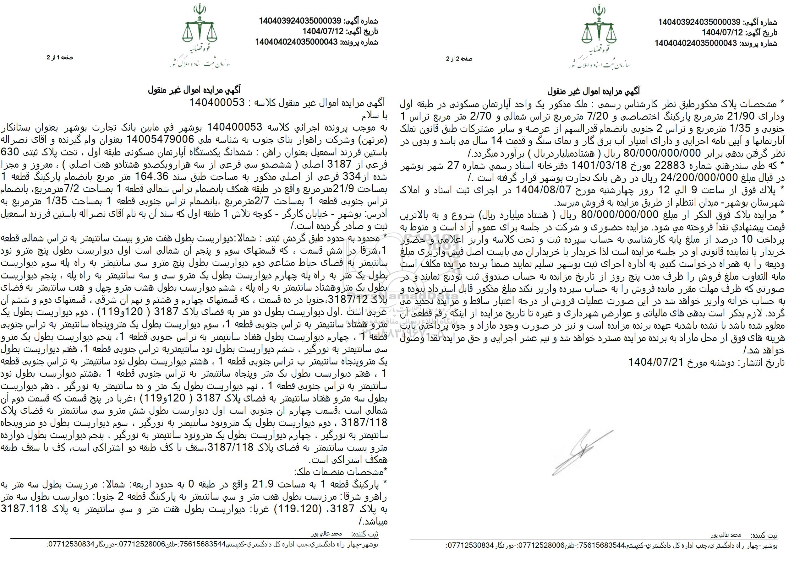 به موجب پرونده اجرائي كلاسه 140400053 بوشهر في ما بین بانک تجارت بوشهر بعنوان بستانکار (مرتهن) و شرکت راهوار بناي جنوب به شناسه ملی 14005479006 بعنوان وام گیرنده و آقای نصراله باستین فرزند اسمعیل بعنوان راهن : ششدانگ یکدستگاه آپارتمان مسکونی طبقه اول، تحت پلاک ثبتی 630 فرعی از 3187 اصلی (ششصد و سی فرعی از سه هزار و یکصد و هشتاد و هفت اصلی)، مغرور و مجرا شده از 334 فرعی از اصلی مذکور به مساحت طبق سند 164.36 متر مربع بانضمام پارکینگ قطعه 1 بمساحت 21.9 متر مربع واقع در طبقه همکف با نضمام تراس شمالی قطعه 1 بمساحت 7.2 متر مربع، بانضمام تراس جنوبی قطعه 1 بمساحت 2.7 متر مربع بانضمام تراس جنوبی قطعه 1 بمساحت 1.35 متر مربع به آدرس: بوشهر - خیابان کارگر - کوچه تلاش 1 طبقه اول که سند آن به نام آقای نصراله باستین فرزند اسمعیل ثبت و صادر گردیده است.