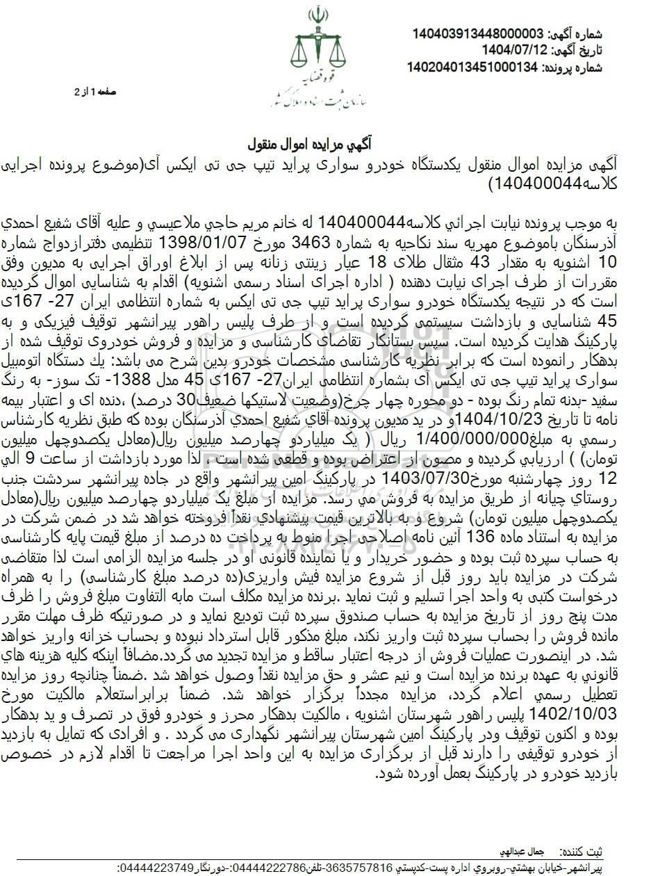 آگهی مزایده اموال منقول یکدستگاه خودرو سواری پراید تیپ جی تی ایکس آی (موضوع پرونده اجرایی کلاسه 140400044)