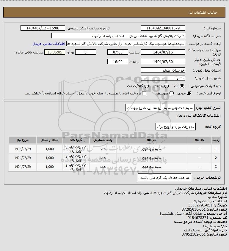نام دستگاه خریدار:شرکت پالایش گاز شهید هاشمی نژاد استان خراسان رضوی