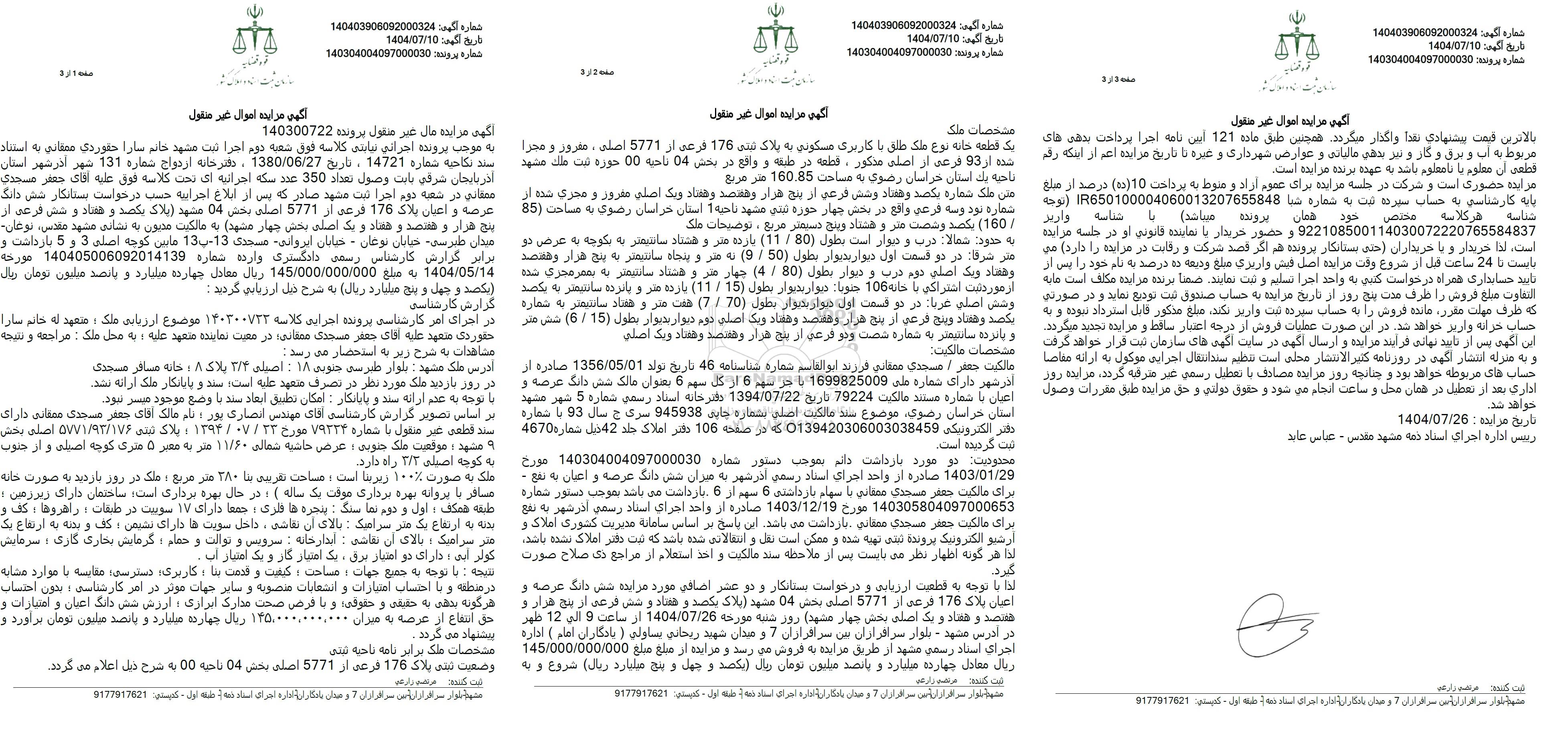مزیده فروش ششدانگ عرصه و اعیان ملک به پلاک ثبتی 176 فرعی از 5771 اصلی به مساحت ..... واقع در میدان طبرسی خیابان نوغلان خیابان ایروانی مسجدی 13 پ 13