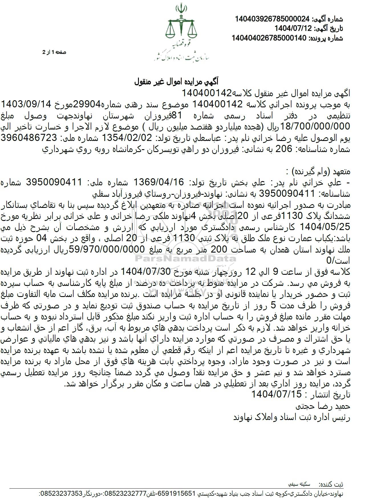 به موجب پرونده اجرائي كلاسه 140400142 موضوع سند رهنی شماره 29904 مورخ 1403.09.14 تنظیمی در دفتر اسناد رسمی شماره 81 فیروزان شهرستان نهاوند جهت وصول مبلغ 18.700.000.000 ریال هجده) میلیارد دو هفتصد میلیون ریال) موضوع لازم الاجرا و خسارت تاخير الی