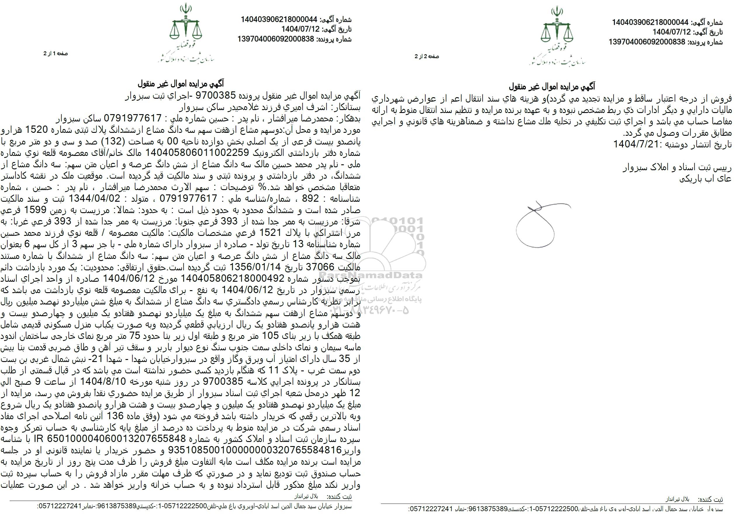 آگهی مزایده اموال غیر منقول پرونده 9700385 - اجرای ثبت سبزوار بستانکار اشرف امیری فرزند غلام حیدر ساکن سبزوار بدهکار محمدرضا میرافشار ، نام پدر : حسین شماره ملی : 0791977617 ساکن سبزوار مورد مزایده و محل آن دوسهم مشاع از هفت سهم سه دانگ مشاع از ششدانگ پلاک ثبتی شماره 1520 قرارو پانصدو بیست فرعی از یک اصلی بخش دوازده ناحیه 00 به مساحت (132) صد و سی و دو متر مربع با شماره دفتر بازداشتی الکترونیک 140405806011002259 مالک خانم . آقای معصومه قلعه نوي شماره ملی - نام پدر محمد حسین مالک سه دانگ مشاع از شش دانگ عرصه و اعیان متن سهم سه دانگ مشاع از ششدانگ در دفتر بازداشتی و پرونده ثبتی و سند مالکیت قید گردیده است. موقعیت ملک در نقشه کاداستر متعاقبا مشخص خواهد شد. توضیحات: سهم الارت محمدرضا میرافشار، نام پدر: حسین ، شماره شناسنامه : 892، شماره شناسه ملی : 0791977617 ، متولد : 1344.04.02 ثبت و سند مالکیت صادر شده است و ششدانگ محدود به حدود ذیل است: به حدود شمالا مرزیست به زمین 1599 فرعی شرقا مرزیست به ممر جدا شده از 393 فرعي جنوبا مرزیست به ممر جدا شده از 393 فرعی غربا به مرز اشتراکی با پلاك 1521 فرعي مشخصات مالکیت مالکیت معصومه . قلعه نوي فرزند محمد حسین شماره شناسنامه 13 تاریخ تولد - صادره از سبزوار دارای شماره ملی - با جز سهم 3 از کل سهم 6 بعنوان مالک سه دانگ مشاع از شش دانگ عرصه و اعیان متن سهم سه دانگ مشاع از ششدانگ با شماره مستند مالكيت 37066 تاريخ 1356.01.14 ثبت گردیده است. حقوق ارتفاقی محدودیت یک مورد بازداشت دانم بموجب دستور شماره 140405806218000492 مورخ 1404.06.12 صادره از واحد اجرای استاد رسمی سبزوار در تاریخ 1404.06.12 به نفع - برای مالکیت معصومه قلعه نوي بازداشت می باشد که برابر نظریه کارشناس رسمی دادگستری سه دانگ مشاع از ششدانگ به مبلغ شش میلیاردو نهصد میلیون ریال و دوسهم مشاع از هفت سهم ششدانگ به مبلغ یک میلیارد و نهصد و هفتاد و یک میلیون و چهار صدو بیست و هشت هزار و پانصد و هفتاد و یک ریال ارزیابی قطعی گردیده و به صورت یکباب منزل مسکونی قدیمی شامل طبقه همکف با زیر بنای 105 متر مربع و طبقه اول زیر بنا حدود 75 متر مربع نمای خارجی ساختمان اندود ماسه سیمان و نمای داخلی سمت جنوب سنگ نوع دیوار باربر و سقف تیر آهن و طاق ضربی قدمت بنا بیش از 35 سال دارای امتیاز آب و برق و گاز واقع در سبزوار خیابان شهدا - شهدا -21 نيش شمال غربی بن بست. دوم سمت غرب - پلاک 11 که هنگام باردید کسی حضور نداشته است میباشد که در قبال قسمتی از طلب بستانکار در پرونده اجرایی کلاسه 9700385 در روز شنبه مورخه 1404.8.10 از ساعت 9 صبح الی 12 ظهر در محل شعبه اجراي ثبت اسناد سبزوار از طریق مزایده حضوري نقداً بفروش می رسد. مزایده از مبلغ یک میلیارد و نهصد و هفتاد و یک میلیون و چهار صد و بیست و هشت هزار و پانصد و هفتاد و یک ریال شروع و به بالاترین رقمی که خریدار داشته باشد فروخته می شود وفق ماده 136 آئین نامه اصلاحی اجرای مفاد اسناد رسمی شرکت در مزایده منوط به پرداخت ده درصد از مبلغ پایه کارشناسی به حساب تمرکز وجوه سپرده سازمان ثبت اسناد و املاک کشور به شماره 650100004060013207655848 IR با شناسه وارير 935108500100000000320765584816 و حضور خریدار با نماینده قانونی او در جلسه مزایده است برنده مزایده مکلف است ما به التفاوت مبلغ فروش را ظرف مدت پنج روز از تاریخ مزایده به حساب صندوق ثبت تودیع نماید و در صورتی که ظرف مهلت مقرر مازاد فروش را به حساب سپرده ثبت واریز نکند مبلغ مذکور قابل استرداد نبوده و به حساب خزانه واریز خواهد شد. در این صورت عملیات فروش از درجه اعتبار ساقط و مزایده تجدید می گردد و هزینه های سند انتقال اعم از عوارض شهرداری مالیات دارایی و دیگر ادارات ذی ربط مشخص نبوده و به عهده برنده مزایده و تنظیم سند انتقال منوط به ارائه مقاضا حساب مي باشد و اجرای ثبت تکلیفی در تخلیه ملک مشاع نداشته و ضمنا هرینه های قانونی و اجرایی