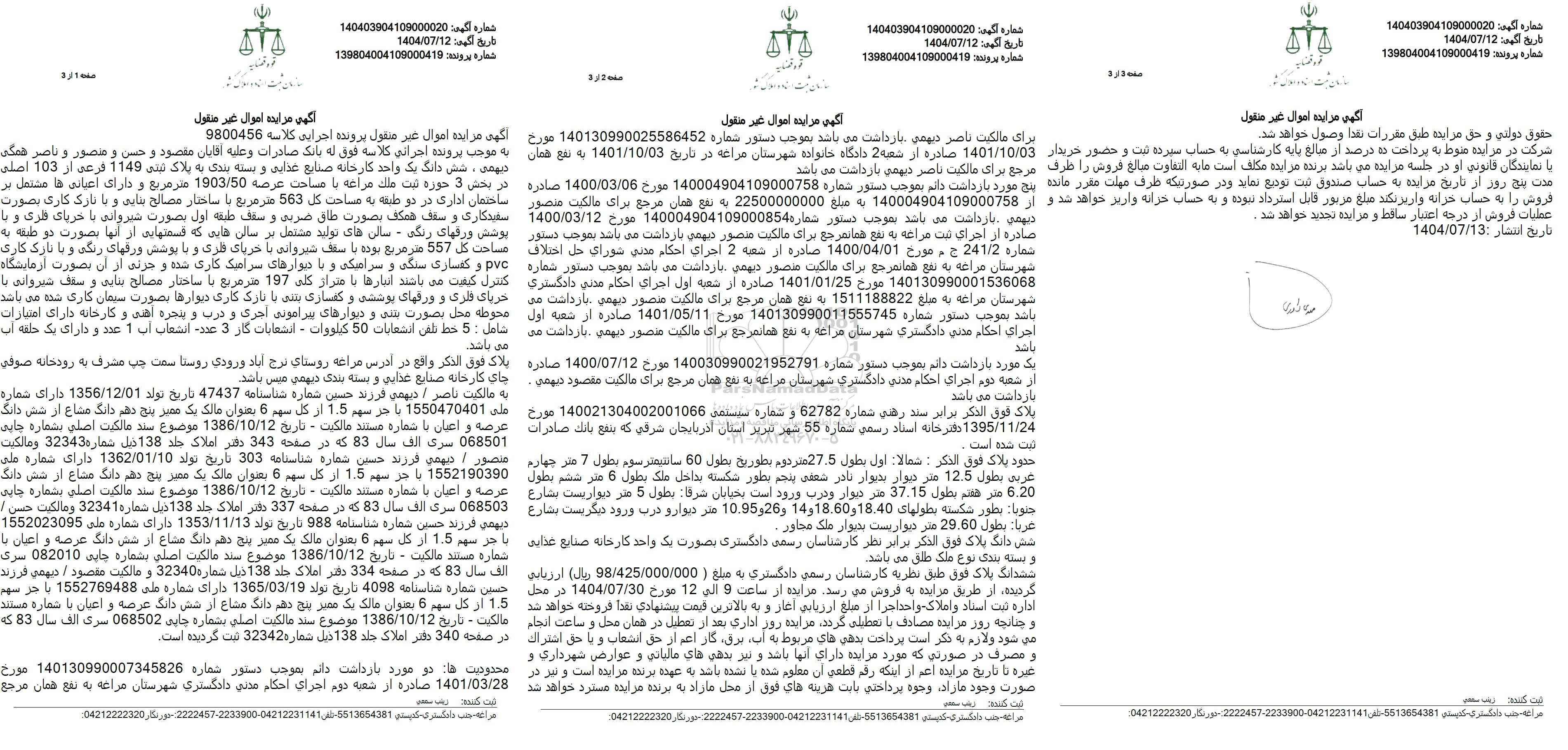 به موجب پرونده اجرائي کلاسه فوق له بانک صادرات و علیه آقایان مقصود و حسن و منصور و ناصر همگی دیهمی ، شش دانگ یک واحد کارخانه صنایع غذایی و بسته بندی به پلاک ثبتی 1149 فرعی از 103 اصلی در بخش 3 حوزه ثبت ملك مراغه با مساحت عرصه 1903.50 متر مربع و دارای اعیانی ها مشتمل بر ساختمان اداری در دو طبقه به مساحت کل 563 متر مربع با ساختار مصالح بنایی و با نازک کاری بصورت سفیدکاری و سقف همكف بصورت طاق ضربی و سقف طبقه اول بصورت شیروانی با خرپای فلزی و با پوشش ورقهای رنگی - سالنهای تولید مشتمل بر سالن هایی که قسمتهایی از آنها بصورت دو طبقه به مساحت کل 557 متر مربع بوده با سقف شیروانی با خرپای فلزی و با پوشش ورقهای رنگی و با نازک کاری pvc و کفسازی سنگی و سرامیکی و با دیوارهای سرامیک کاری شده و جزئی از آن بصورت آزمایشگاه کنترل کیفیت می باشند انبارها با متراژ کلی 197 متر مربع با ساختار مصالح بنایی و سقف شیروانی با خرپای فلزی و ورقهای پوششی و کفسازی بتنی با نازک کاری دیوارها بصورت سیمان کاری شده می باشد محوطه محل بصورت بتنی و دیوارهای پیرامونی اجری و درب و پنجره آهنی و کارخانه دارای امتیازات شامل : 5 خط تلفن انشعابات 50 كيلووات - انشعابات گاز 3 عدد انشعاب آب 1 عدد و دارای یک حلقه آب می باشد.