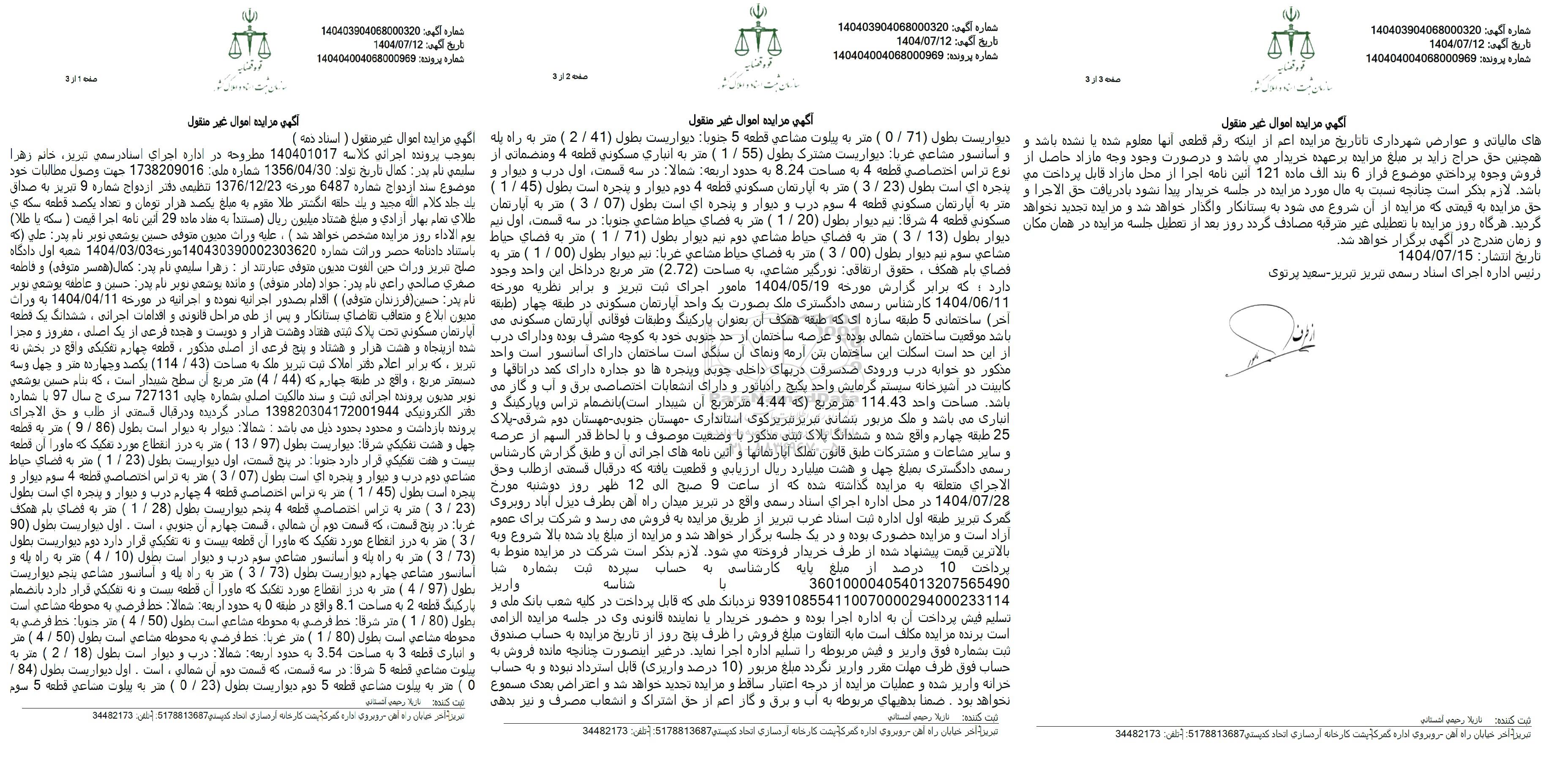 گهی مزایده اموال غیر منقول (اسناد ذمه) بموجب پرونده اجرایی کلاسه 140401017 مطروحه در اداره اجرای اسناد رسمی تبریز، کالم زهرا اسلامی نام پدر کمال تاریخ تولد 356.04.30 شماره على 1738209016 حیث وصول مطالبات خود موضوع سند ازدواج شماره 6487 مورخه 1378.12.23 تنظیمه، نفر ازدواج شماره 9 تبریز به صداق گستر طلا موم به مبلغ یکصد هزار تومان و تعداد یکصد قطعه سکه ی بک عند کلام الله محمد وت حقه انگستره طلای تمام بهار آزادی و مبلغ هشتاد میلیون ریال مستندا به مقداد ماده 29 این نامه اجرا قیمت (سکه با طلا) یوم الاداء روز مزایده مشخص خواهد شد. علیه ورات مدیون متولی حسین یوشعی نام پدر علی دادنامه حصر وراثت شماره 140430390002303620 مورخه 1404.03.03 شعبه اول دادگاه صلح تبریر ورات حتى الموت مدیون متوفی عبارتند از: زهرا سلیمی نام پدر کمال (همستر مترقی و فاطمه صفری صالحی راعی نام پدر جواد مادر صوفی) و مائده یوسفی نویر نام پدر حسین و عاطفه پوستی نویر نام پدر: حسن صدور اجرائیه نموده و اجرائیه در مورخه 1404.04.11 به وران مدیون ابلاغ و متعاقب تقاضای بستانکار و پس از طی مراحل قانونی و اقدامات اجرائی ، ششدانگ یک قطعه آپارتمان مسکونی تحت پلاک ثبتی هفتاد و هشت هزار و دویست و هجده فرعی از یک اصلی ، مفرور و مجرا شده از پنجاه و هشتد هزار و پنج فرعی از اصلی مذکور، قطعه چهارم تفکیکی ...