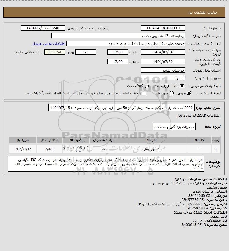 | 1 | -- | شلوار بیمار | عدد | تجهیزات پزشکی و سلامت | 2,000 | 1404/07/17 |