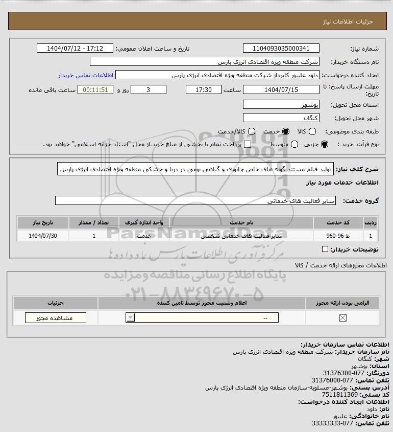 شرح کلی نیاز: تولید فیلم مستند گونه های خاص جانوری و گیاهی بومی در دریا و خشکی منطقه ویژه اقتصادی انرژی پارس