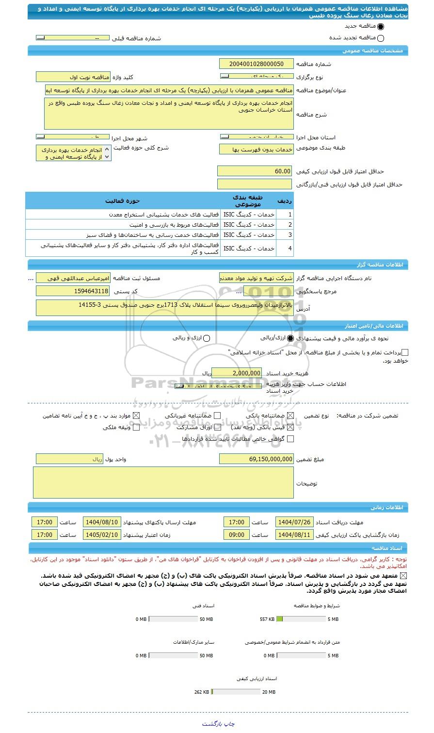 علاقه‌مندان می‌توانند جهت دریافت اسناد و اطلاعات تکمیلی، مناقصه مناقصه عمومی همزمان با ارزیابی (یکپارچه) یک مرحله ای انجام خدمات بهره برداری از پایگاه توسعه ایمنی و امداد و نجات معادن زغال سنگ پروده طبس با سامانه مناقصات و مزایدات ایران پارس‌نماد داده ها 88349670 تماس حاصل نمایند.
