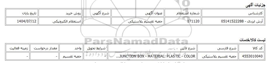 آرش ایزدی - 05141522288 | 171120 | جعبه تقسیم پلاستیکی | استعلام الکترونیکی | 1404/07/12 |