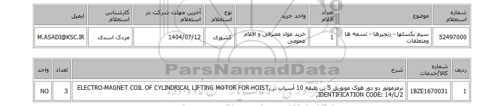 52497000سیم بکسلها - زنجیرها - تسمه ها ومتعلقات1خرید مواد مصرفی و اقلام عمومیکشوری1404/07/12مزدک اسدیM.ASADI@KSC.IR