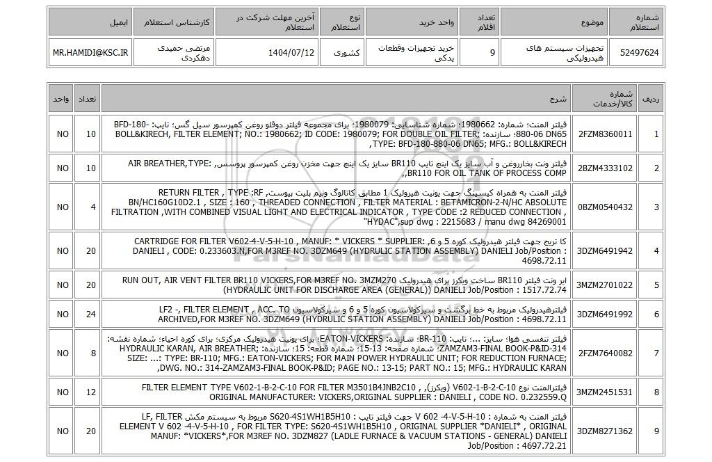 52497624 | تجهیزات سیستم های هیدرولیکی | 9 | خرید تجهیزات وقطعات یدکی | کشوری | 1404/07/12 | مرتضی حمیدی دهکردی | MR.HAMIDI@KSC.IR |