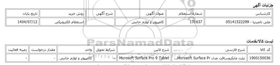 علی ناصرنیا - 05141522299 | 171637 | کامپیوتر و لوازم جانبی | استعلام الکترونیکی | 1404/07/12 |