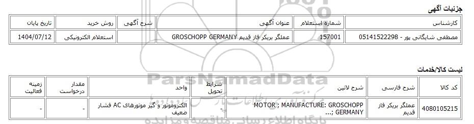 مصطفی شایگانی پور - 05141522298 | 157001 | عملگر بریکر فاز قدیم GROSCHOPP GERMANY | استعلام الکترونیکی | 1404/07/12 |