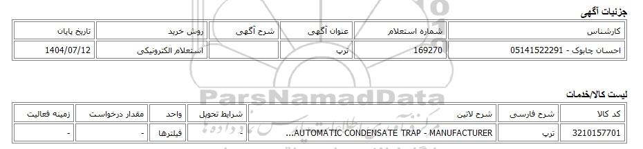 احسان چابوک - 05141522291 | 169270 | ترپ | استعلام الکترونیکی | 1404/07/12 |