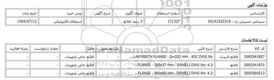 15 استعلام الکترونیکی فلانچ 9643378 1404/07/13 new special not payed خراسان رضوی