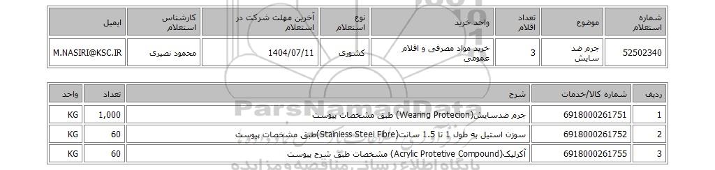 52502340 | جرم ضد سایش | 3 | خرید مواد مصرفی و اقلام عمومی | کشوری | 1404/07/11 | محمود نصیری | M.NASIRI@KSC.IR |