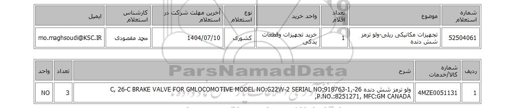 52504061 | تجهیزات مکانیکی ریلی-ولو ترمز شش دنده | 1 | خرید تجهیزات وقطعات یدکی | کشوری | 1404/07/10 | محمد مقصودی | mo.maghsoudi@KSC.IR |