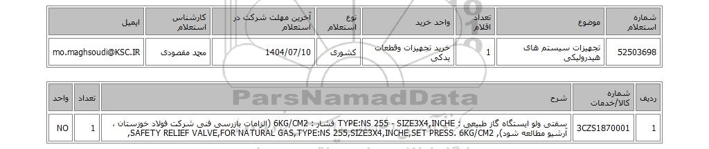 52503698تجهیزات سیستم های هیدرولیکی1خرید تجهیزات وقطعات یدکیکشوری1404/07/10محمد مقصودیmo.maghsoudi@KSC.IR