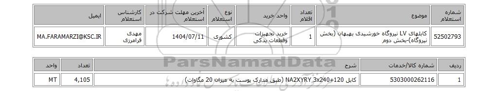 52502793 | کابلهای LV نیروگاه خورشیدی بهبهان (بخش نیروگاه)-بخش دوم | 1 | خرید تجهیزات وقطعات یدکی | کشوری | 1404/07/11 | مهدی فرامرزی | MA.FARAMARZI@KSC.IR |
