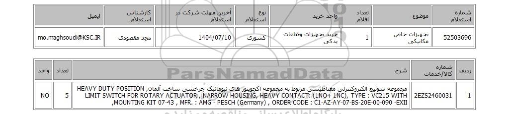 52503696 | تجهیزات خاص مکانیکی | 1 | خرید تجهیزات وقطعات یدکی | کشوری | 1404/07/10 | محمد مقصودی | mo.maghsoudi@KSC.IR |