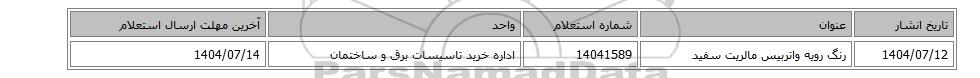 | 1404/07/12 | رنگ رویه واتربیس مالریت سفید | 14041589 | اداره خرید تاسیسات برق و ساختمان | 1404/07/14 |