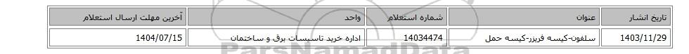 | 1403/11/29 | سلفون-کیسه فریزر-کیسه حمل | 14034474 | اداره خرید تاسیسات برق و ساختمان | 1404/07/15 |