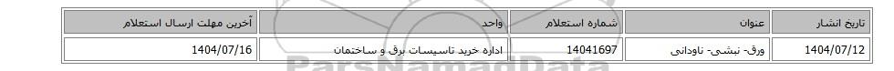 | 1404/07/12 | ورق- نبشی- ناودانی | 14041697 | اداره خرید تاسیسات برق و ساختمان | 1404/07/16 |